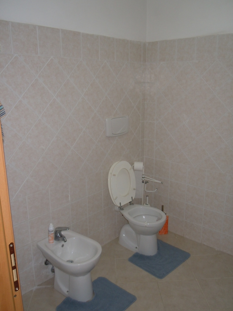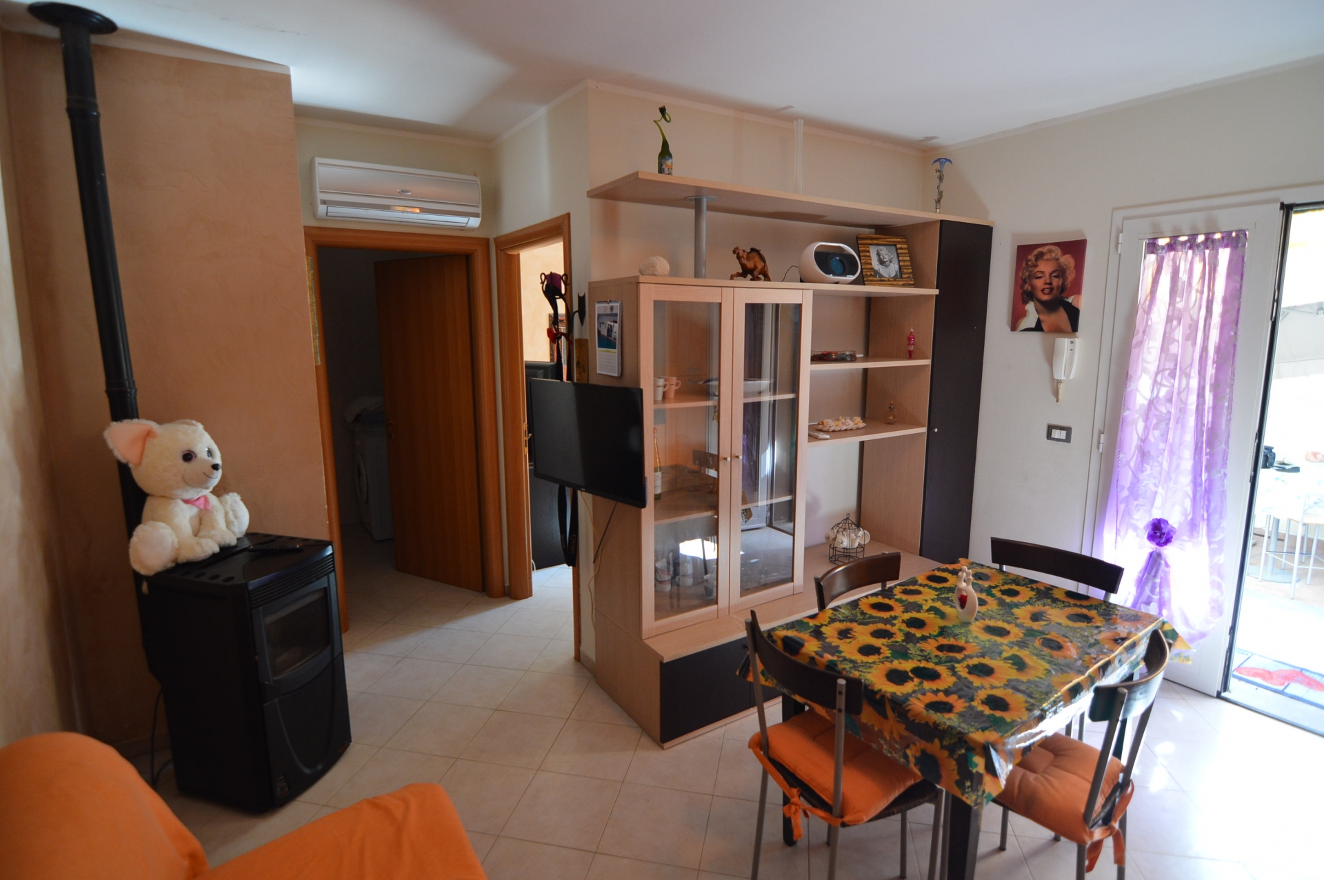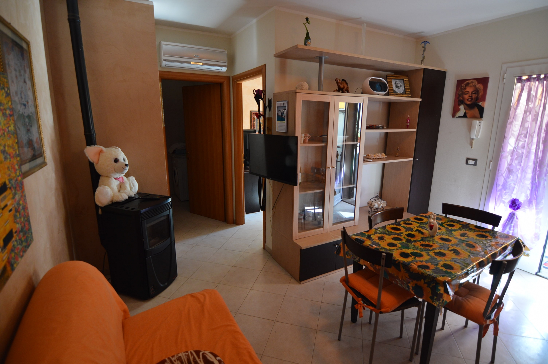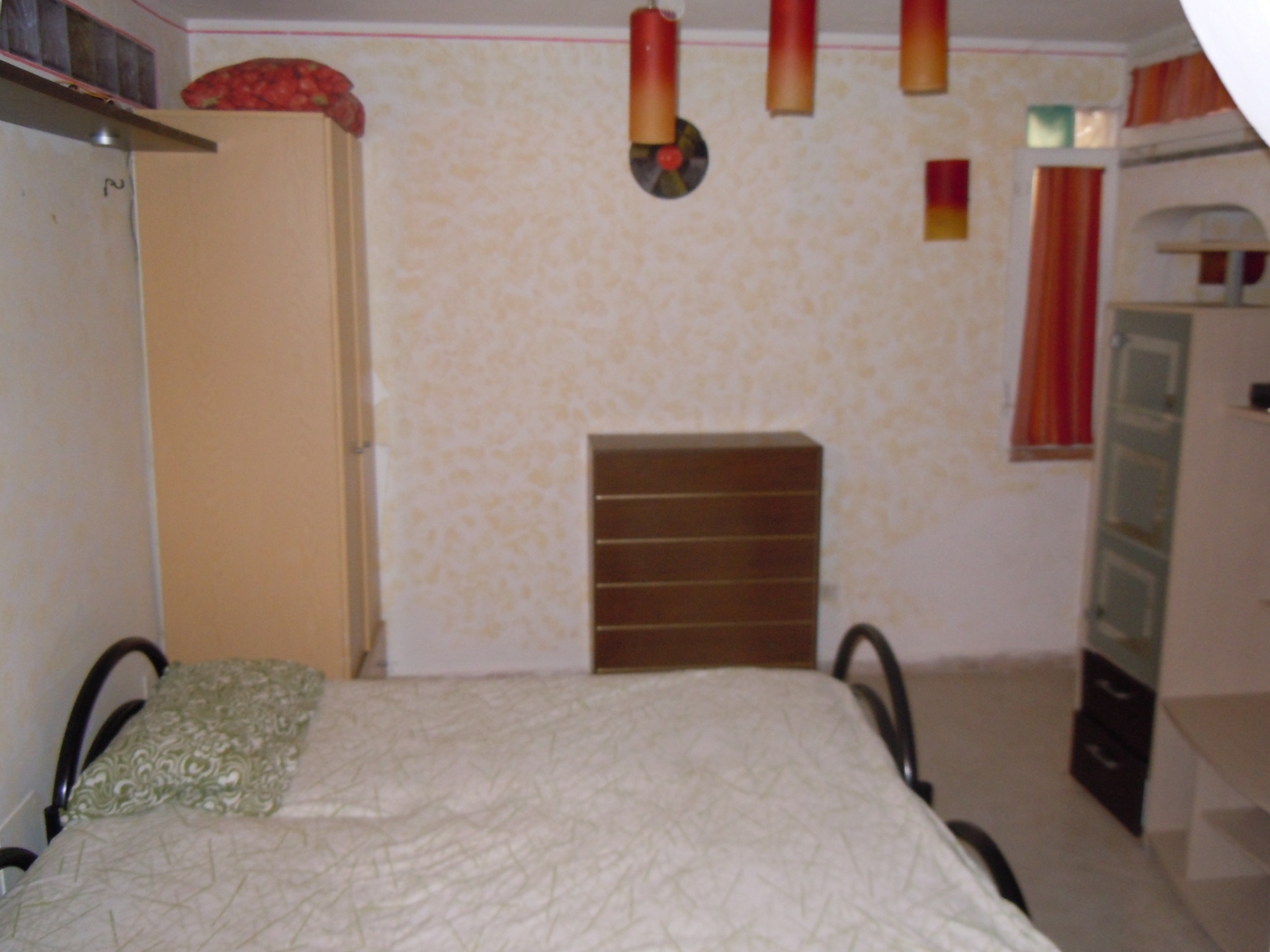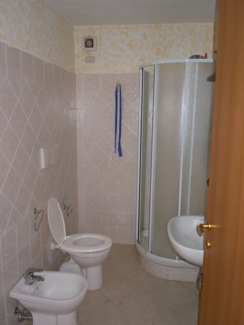 Vendesi Bilocale con piccolo resede privato e annessi due vani cantina ed un bagno al piano primo sottostrada.\nL'immobile è posto su due livelli, Al piano rialzato: Soggiorno con angol cottura, camera matrimoniale, bagno con box doccia, terrazza, resede esclusivo; AL piano primo sottostrada due vani ad uso cantina, tinello ed un bagno con box doccia. \nL'appartamento è di recente costruzione, completamente arredato con ottime rifiniture, dotato di climatizzatore e stufa a pellet.\nSi precisa che il terreno dove insiste la costruzione è in diritto di superficie per 60 anni con il Demanio.